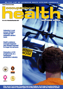 Occupational Health Southern Africa is on the Department of Higher Education and Training’s list of Approved South African Journals; authors of peer-reviewed papers thus qualify for subsidies for their affiliated tertiary institutions. It is also listed in African Index Medicus; and is on the International Committee of Medical Journal Editors (ICMJE) website list of journals following the ICMJE recommendations for the conduct, reporting, editing and publication of scholarly work in medical journals.