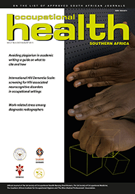 Occupational Health Southern Africa is on the Department of Higher Education and Training’s list of Approved South African Journals; authors of peer-reviewed papers thus qualify for subsidies for their affiliated tertiary institutions. It is also listed in African Index Medicus; and is on the International Committee of Medical Journal Editors (ICMJE) website list of journals following the ICMJE recommendations for the conduct, reporting, editing and publication of scholarly work in medical journals.