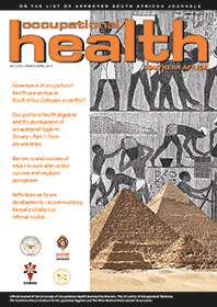 Occupational Health Southern Africa is on the Department of Higher Education and Training’s list of Approved South African Journals; authors of peer-reviewed papers thus qualify for subsidies for their affiliated tertiary institutions. It is also listed in African Index Medicus; and is on the International Committee of Medical Journal Editors (ICMJE) website list of journals following the ICMJE recommendations for the conduct, reporting, editing and publication of scholarly work in medical journals.